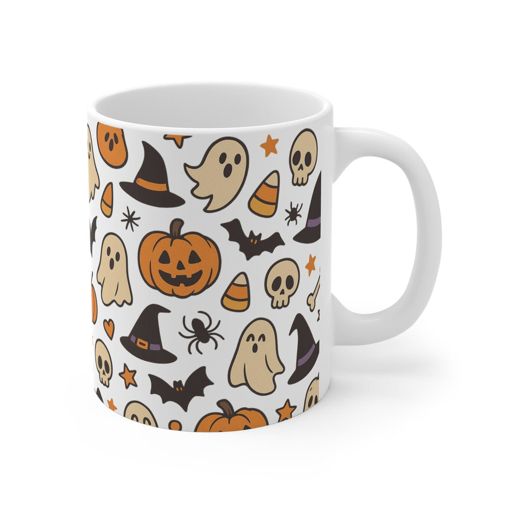Not every Halloween has to be blood, guts, and trauma. This mug is for the soft ghouls, the pastel punks, and the pumpkin spice lovers who still say “boo” with a smile. Featuring a charming chaos of ghosts, pumpkins, bats, and bones — it’s spooky season, but make it adorable.